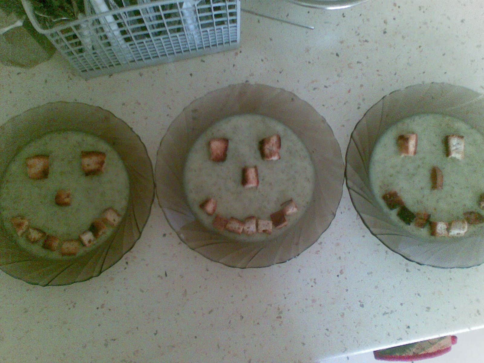 I last but not least – monotonne jedzenie. Mimo, że moja córka ma swoje ulubione potrawy to czasem jestem w stanie nakłonić ja do zjedzenia czegoś zupełnie innego. Nawet czegoś czego nie lubi. Wszystko zależy od sposobu podania, zrobienia magii wokół jedzenia. Poniżej zobaczysz kilka fotek które przedstawiają zupę krem z cukinii z grzankami (uśmiechnięta zupa), frytki z kotletem mielonym (Fred z włosami) i ziemniaki ze zrazem, ogórkami kiszonymi i buraczkami tartymi (Pan Bulwa). Nazwy z nawiasów – to nazwy jakie dzieciaki nadały tym potrawom :)