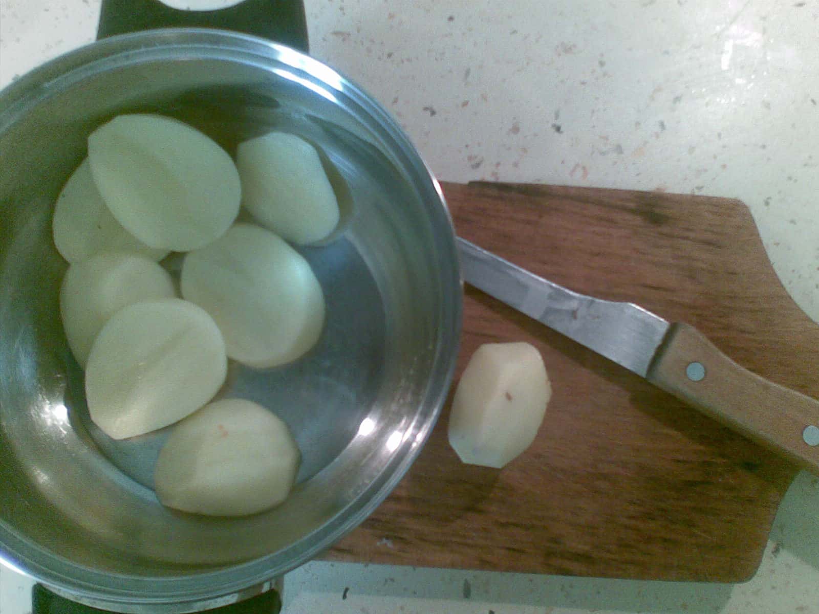 2. Do garnka wlewam 2 litry wody, dodaję sól i przyprawy, pokrojone w talarki, obrane ziemniaki ziemniaki, obrane marchewkę, pietruszkę i cebulę i gotuję, aż ziemniaki będą na wpół miękkie (ok 10-15 minut)